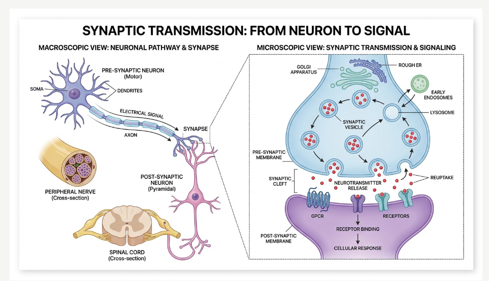 以简洁的信息图表风格创作神经元突触的科学插图。风格建议:如有需要,可使用水平或垂直面板来按顺序展示步骤。插图风格:平面2D矢量,形状圆润光滑,轮廓细而深,背景纯白,无纹理,除主要物体上非常柔和的双色调阴影外,无渐变。使用逼真的调色板,保持构图平衡,留有充足的白色空间,箭头清晰,并为标题和标签留出空间。图表必须高度可读且适合打印,类似于专业医学教科书的图表。所有标签和标题均使用SF Pro Display字体。清晰标注所有重要组件。输出图像的宽高比为16:9。